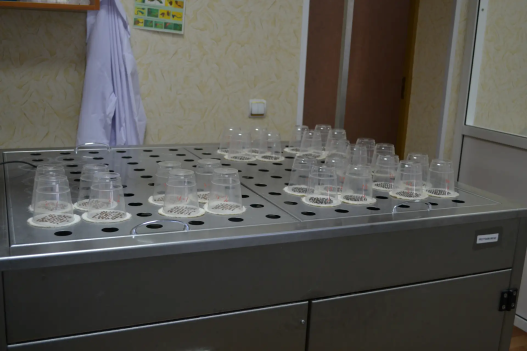 С начала текущего года специалистами филиала проведена оценка характеристик 10 партий свежезаготовленных семян сосны обыкновенной общей массой 100 кг. Оценка посевных качеств семян проводится по ряду показателей: чистота семян, масса 1000 штук семян, энергия прорастания семян, всхожесть семян. Основными показателями при определении класса качества семян хвойных пород являются их чистота и всхожесть. Чистоту семян в процентах определяется отношением массы чистых семян исследуемой породы к первоначальной массе взятой для анализа навески. Для определения всхожести четыре пробы по 100 семян каждая, отобранные из чистых семян, закладываются в аппарат для проращивания сроком на 15 дней, проращивание ведётся при постоянной (22±2 °С) температуре.
